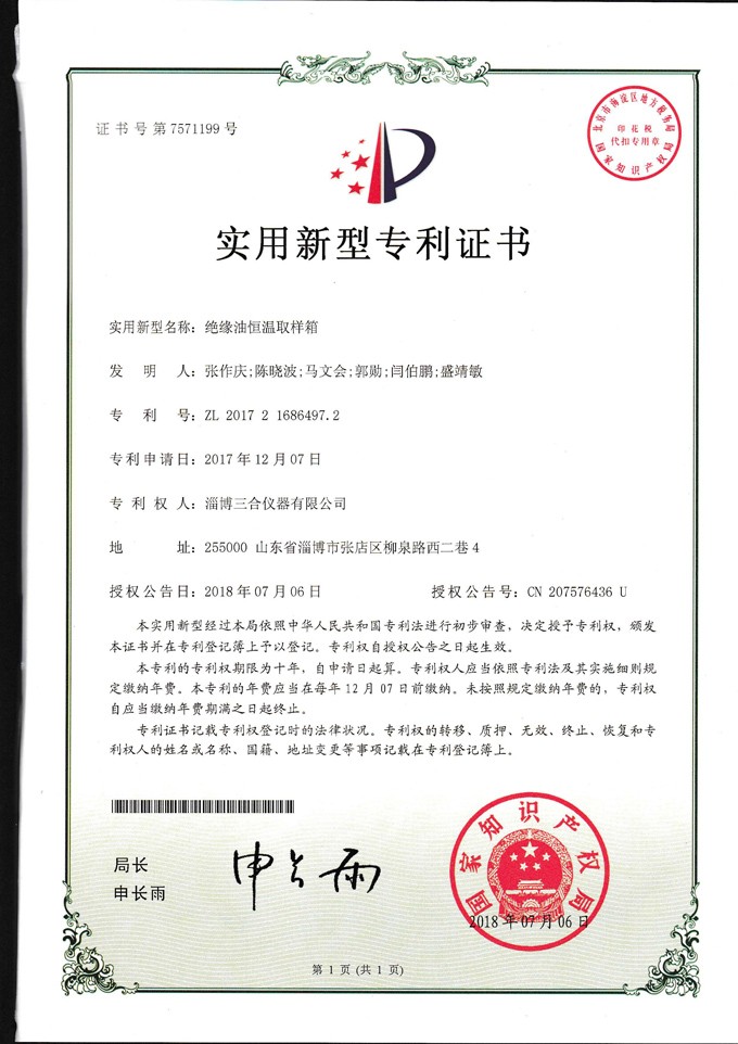 熱烈祝賀我公司產品“絕緣油取樣箱”發明專利獲得國家知識產權局授權。